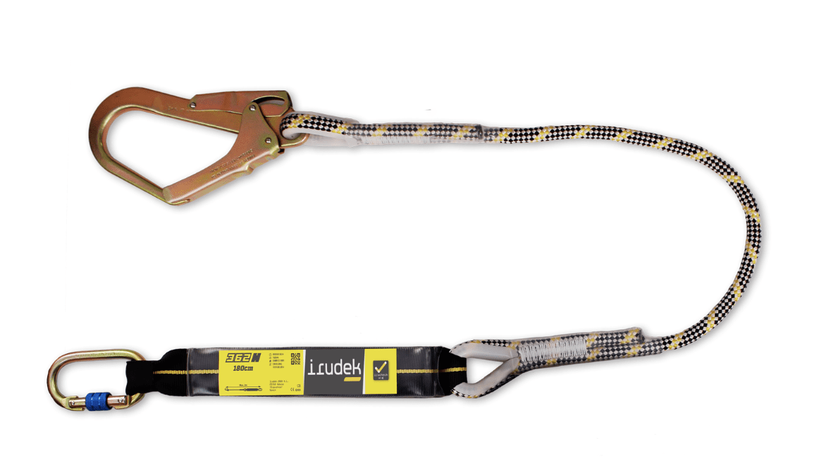 Assorbitore di energia con corda semistatica e connettore in acciaio con apertura di 50mm, progettato per attutire le cadute riducendo la forza di impatto trasmessa all’operatore a meno di 6kN.
