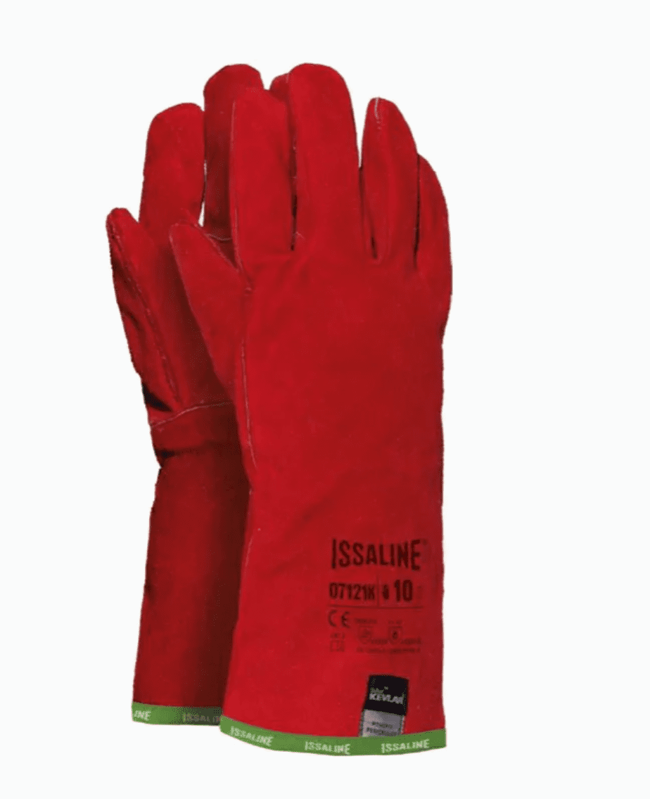 Guanto in crosta di bovino superiore trattata anti-calore (THT). Resiste 15 secondi al calore per contatto con temperatura 100°. Salvacuciture in Kevlar, palmo e dorso manichetta foderato.