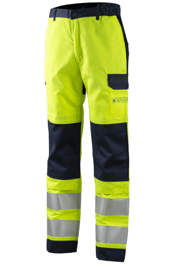 Pantaloni multirischio bicolore con cintura elasticizzata sui lati, passanti, fascetta identificativa nella cintura, 2 tasche all’italiana, 2 tasche posteriori con aletta chiusa, 1 tasca laterale con aletta chiusa, 1 tasca porta-utensil, inserti di